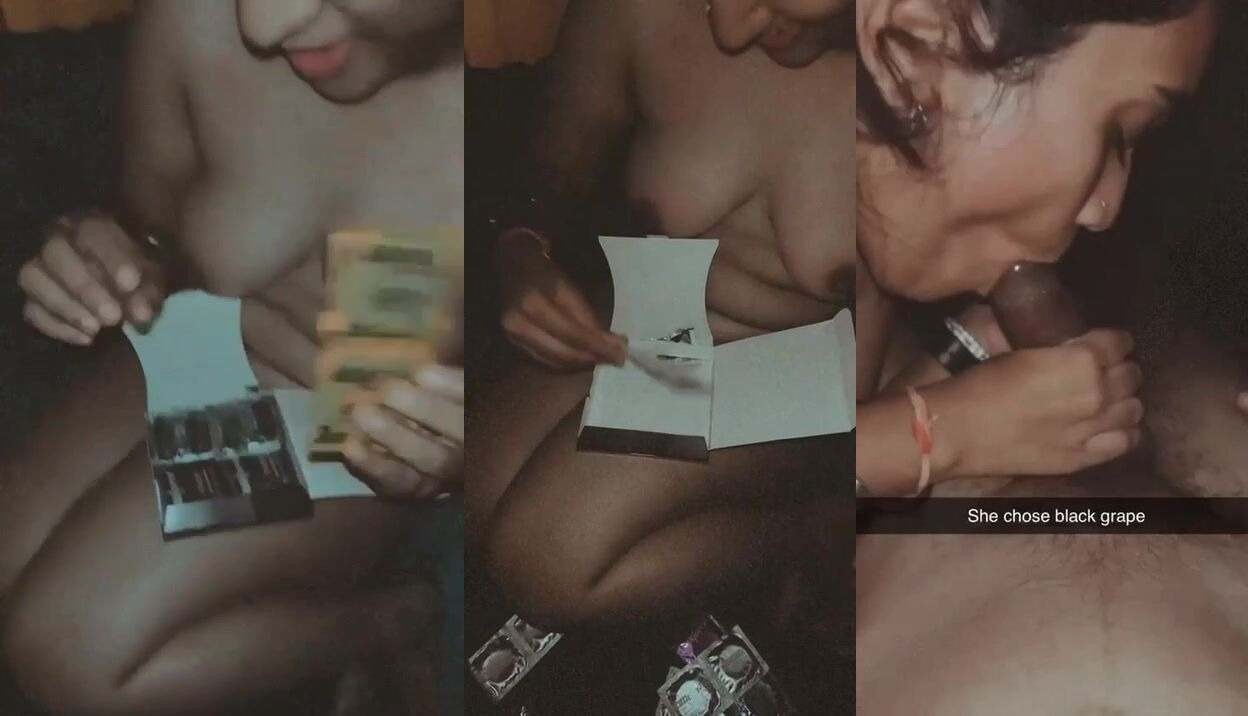 This black boobs desi girl chose black grapes condom from the many flavors. And she put that on top of the cock of her boyfriend. She licked the dick and kissed the tip of the condom. The aroused desi girl was then pumped very hard in doggy pose. She moans really hard as that cock made entry in the deepest areas of her pussy. Boyfriend slapped her busty ass cheeks while fucking her hard in this porn video.